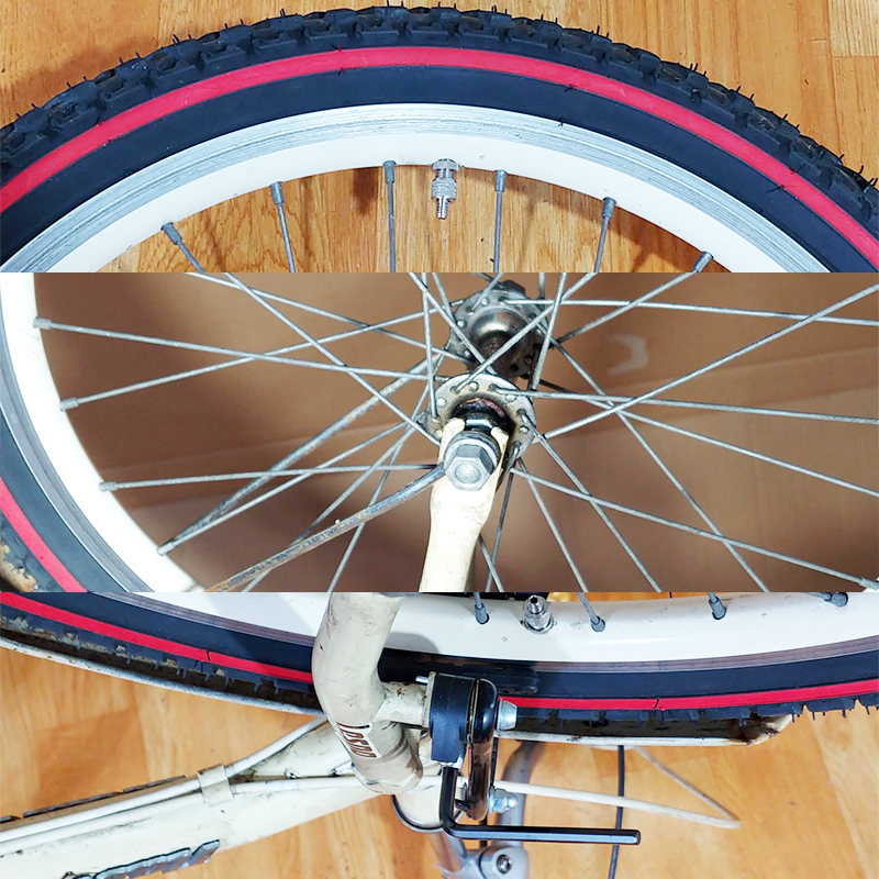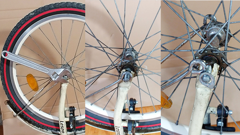 13. 밸브와 튜브가 결합된 부분이 분리 훼손되지 않도록, 튜브를 살살 잡아당겨서 뽑은 후 사진처럼 밸브 조립합니다.  그리고, 타이어의 무늬 방향이 자전거 앞방향과 일치하도록 하면서, 바퀴를 자전거 프레임에 장착하고 앞서 분해했던 부품들을 빠짐없이 조립한 후, 너트가 풀리지 않도록 몽키스패너를 이용하여 꽉 조여서 고정합니다. 앞선 헐렁하게 풀어놨던 브레이크 고무도 육각렌치를 이용하여 단단히 고정합니다.