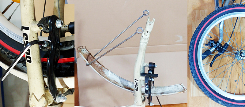 4. 타이어가 브레이크 고무에 걸려서 빠지지 않을 경우 육각렌치를 이용하여 브레이크 고무 고정 볼트를 헐렁하게 풀어준 후, 브레이크 고무 근처에 있는 타이어를 양쪽에서 눌러준후, 바퀴를 자전거 프레임에서 분리합니다.
