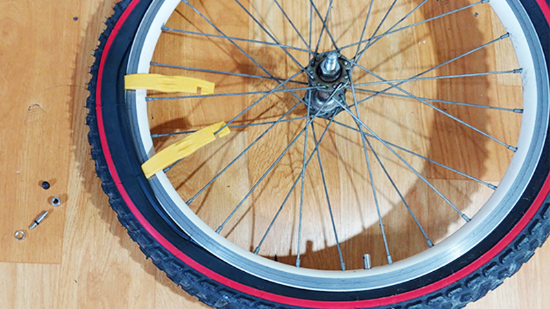 8. 림테이프의 구멍이 튜브 밸트 구멍과 같은 위치가 되도록 림테이프를 바퀴 프레임에 장착합니다.