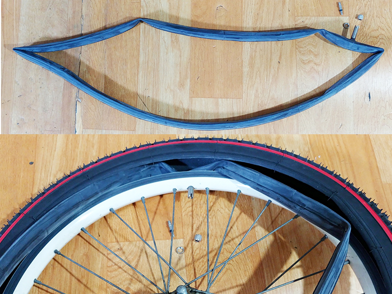 7. 새로운 튜브와 림테이프를 준비합니다. 참고로 림테이프가 장착되어 있는 경우에는 림테이프를 교체하지 않는 것을 추천합니다. 고무 림테이프를 미리 구매해두었으며, 타이어는 20인치이지만 꽉 장착되도록 18인치용 고무 림테이프를 구매하였는데, 20인치용 고무림테이프를 구매하는 것이 좋았을 거 같았습니다.