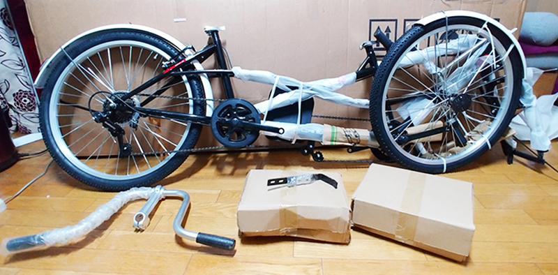 자전거 프레임, 뒷좌석 핸들, 박스2개, 바구니, 바구니 고정용 부품 등이 있습니다. 아쉽지만, 조립 설명서는 별도로 없습니다.