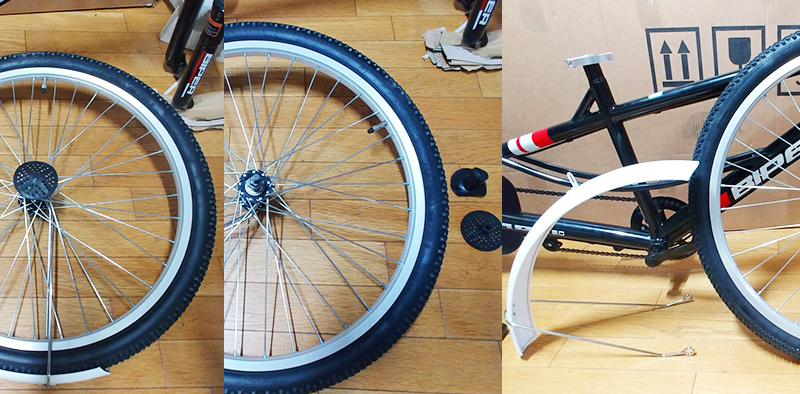 바퀴의 중심 축에 조립된 검정 플라스틱 보호대를 분리하고, 바퀴 프레임 스포크에 끼워져있는 흰색 흙받이를 살살 분리합니다. (스포트가 휘지 않도록 조심히 분리합니다. )