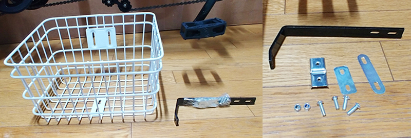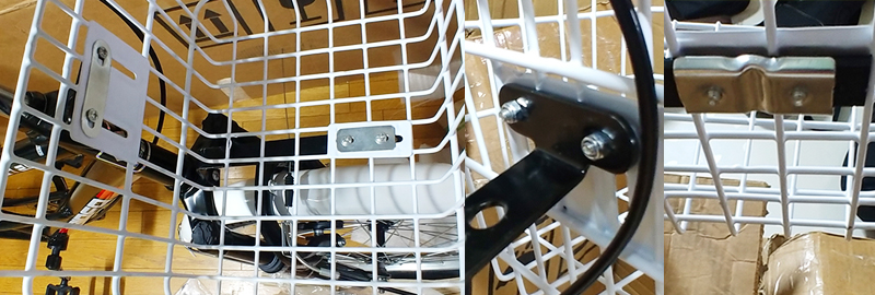 바구니 받침부를 조립하기위해, 앞바퀴 프레임에 고정된 볼트와 너트를 분리한 후, 바구니 받침부를 장착하고 볼트와 너트를 다시 조립합니다. 몽키스패너와 브라이버를 이용하여 고정합니다.