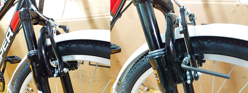 9. 브레이크 고무의 방향과 위치를 아래사진의 오른쪽 사진처럼 잡아주고, 육각렌치를 이용하여 브레이크 고무를 고정시킵니다.