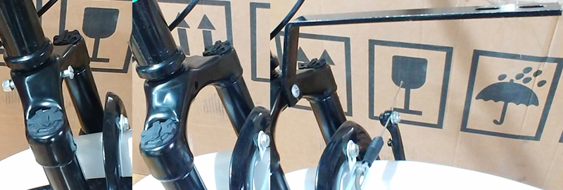 4. 자전거 핸들을 꽂아두고, 사진처럼 앞바퀴 장착 프레임의 앞 방향과 브레이크 선들의 꼬임 꼬이지 않도록 방향을 잡아줍니다. 핸들을 꽂아주기만 하고 고정은 나중에 합니다.