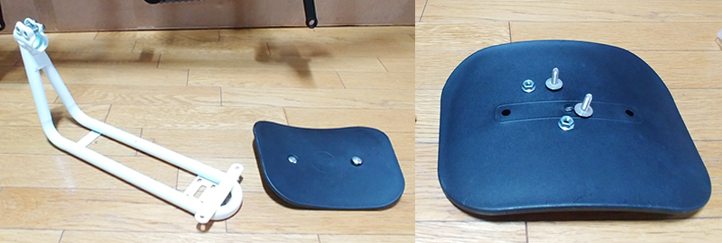 뒷좌석 등받이를 뒤좌석 안장봉에 장착합니다. 이때, 안장봉에 고정되는 등받이 프레임의 연결부는 가급적 안장 가깝도록 장착합니다. 안장봉에 등받이 프레임이 단단히 고정되도록 육각렌치를 이용하여 2개의 볼트를 고정합니다. 앞에서 언급한것처럼, 2개의 볼트를 고정할때는, 등받이 프레임의 볼트 고정부분이 파손되지 않도록 볼트 2개를 번갈아가면서 조금씩 볼트를 회전시켜가면서 고정합니다.