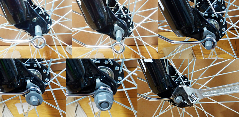 사진의 순서를 참고하여 앞바귀를 자전거의 프레임에 고정합니다. 너트가 풀리지 않을 정도로 몽키스패너를 이용하여 고정합니다.