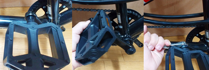 자전거의 페달 프레임에 구멍에는 너트와 같은 나사선이 있으며, 페달의 장착 돌출 나사에는 볼트 처럼 스크류 나사선이 있으므로, 페달이 자전거 페달 프레임에 부드럽게 장착되록 손으로 우선 조립을 한후, 몽키스패너를 이용하여 단단하게 고정합니다. 이때 페달의 스크류와 나사선이 부드럽게 조립되지 않으면 나사선이 파손되어 망가질수 있으니 분리했다가, 부드럽게 잘 맞아서 조립되도록 다시 결합 조립을 시도하는것이 좋습니다.