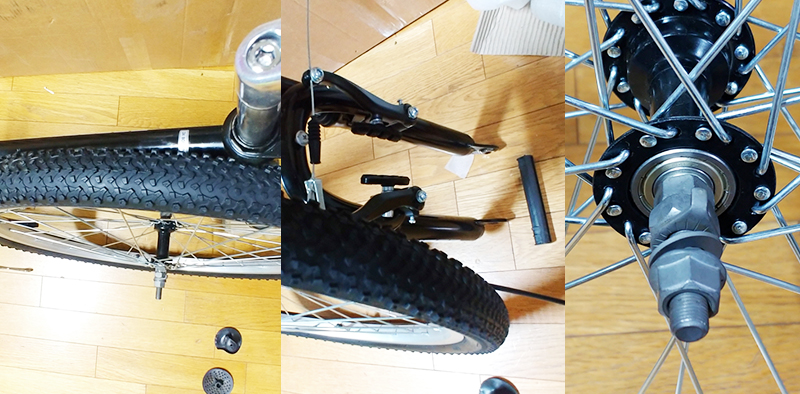 앞바퀴의 중심축에 조립되어있는 너트와 와샤등이 조립된 순서를 잘 봐둔 후, 분해하여 주변에 잘 보관해줍니다.