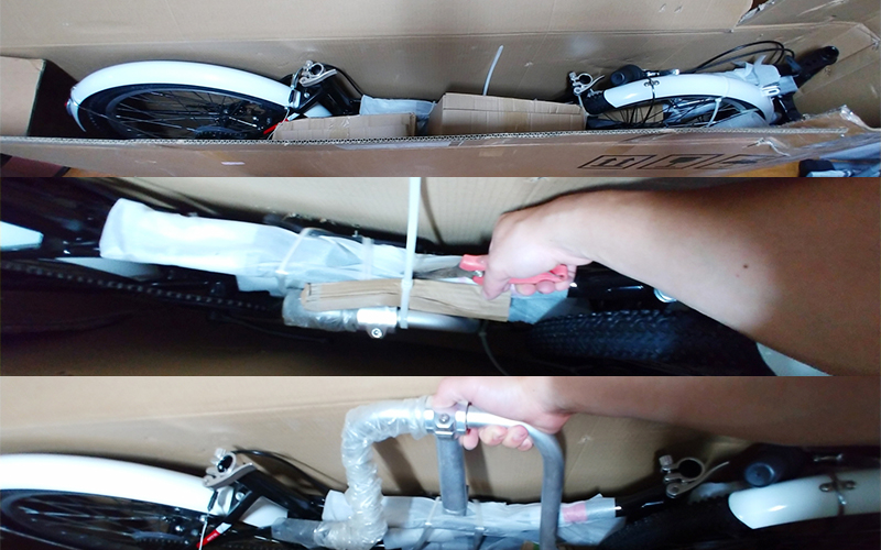 작은 박스 2개를 먼저 꺼낸 후, 자전거를 박스에서 꺼냅니다.