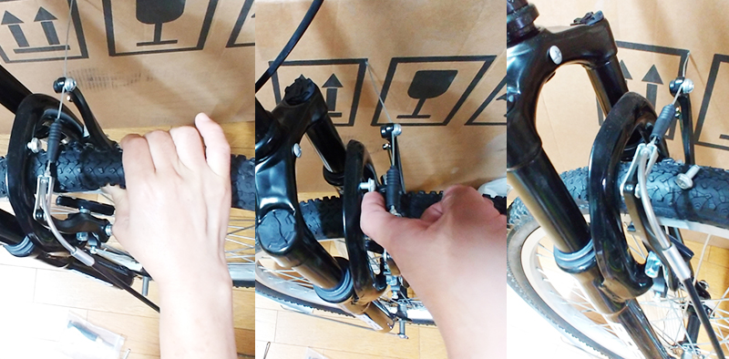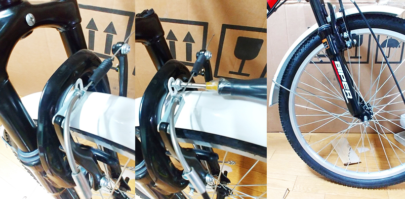 앞바퀴를 자전거 프레임에 장착하고, 이때, 타이어가 브레이크에 통과되도록 타이어를 양 옆에서 눌러줍니다. 타이어에 바람이 빵빵하게 채워줘서 타이어를 브레이크 고무를 통과시키기 어려우면, 타이어 튜브의 밸브의 상단 너트부분을 너트 풀듯이 풀어서 바람을 적당하게 빼주시 시작하며, 타이어를 브레이크 고무 사이를 잘 통과할수 있을 정도까지 바람을 빼줍니다. (순서 상으로는 흙받이를 먼저 조립하는 것이 편리합니다. )
