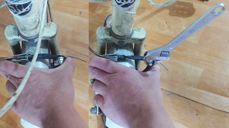 브레이크 속선이 고정에서 풀리면, 손으로 블레이크 양쪽 간격을 손으로 잡아서, 브레이크 속선이 고정되기 이전보다 더 닫히게 한 후, 밖으로 돌출된 브레이크 속선을 잡아당겨서 브레이크 레버가 살짝 잡히기 직전까지 되도록 한 후, 몽키스패너를 이용하여 브레이크 속선을 단단히 고정합니다.