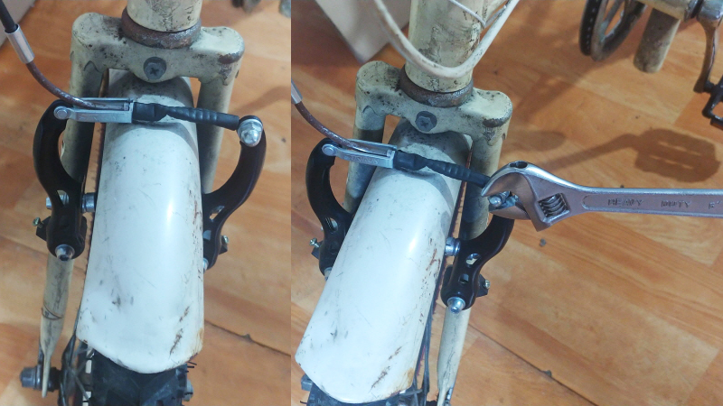 브레이크 속선이 고정에서 풀리면, 손으로 블레이크 양쪽 간격을 손으로 잡아서, 브레이크 속선이 고정되기 이전보다 더 닫히게 한 후, 밖으로 돌출된 브레이크 속선을 잡아당겨서 브레이크 레버가 살짝 잡히기 직전까지 되도록 한 후, 몽키스패너를 이용하여 브레이크 속선을 단단히 고정합니다.