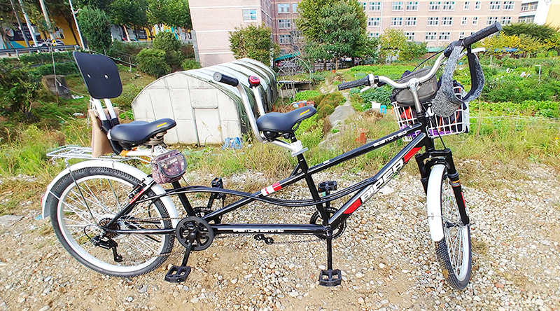 시험 삼아서 아침에 텃밭 갈때 2인용 자전거로 첫 라이딩을 하였습니다.