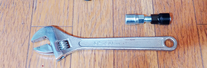 다음으로는, 크랭크의 리무버의 은색 육각 머리 부분에 몽키스패너를 고정한 후,