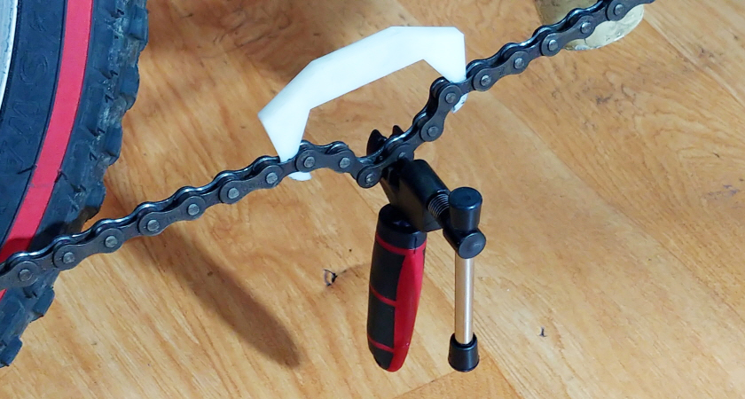 체인절단기 또는 체인리무버라고 합니다. 체인을 절단하는데 사용되며, 체인 마디를 연결하는 핀을 제거하여 체인 마디를 분리하는 도구입니다. 체인 교체하는 과정 중에서 대체가 불가능한 제일 중요한 도구인 듯 합니다.