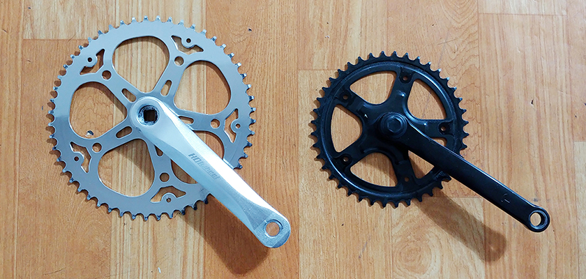 2인용 탠덤 자전거의 크랭크셋을 40T에서 52T인 체인링을 가진 것으로 교체하였는데,