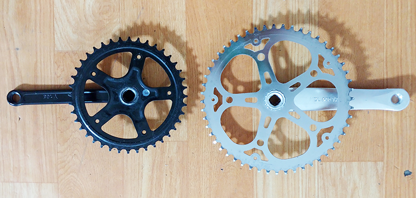 2인용 탠덤 자전거의 크랭크셋을 40T에서 52T인 체인링을 가진 것으로 교체하였는데,