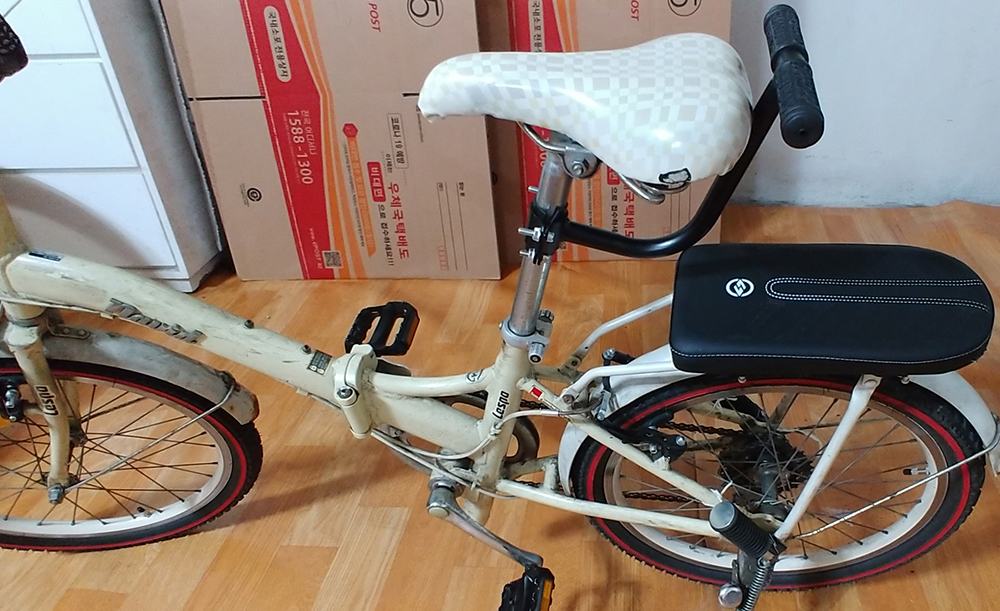 자전거 뒤 짐받이에 뒷좌석을 만들기 위해 뒷자석 보조 안장 쿠션과 보조 받침 페달을 장착하였는데, 손잡이가 없으니 뒤에 앉으면 손으로 잡을 곳이 자전거 안장외에는 없었습니다. 때문에 안장이 뒤에 앉은 사람이 잡아당기는 힘까지 받게되며, 견디다 못해 안장 내부의 플라스틱 메인 프레임이 앞뒤로 분리파손된 상태입니다.