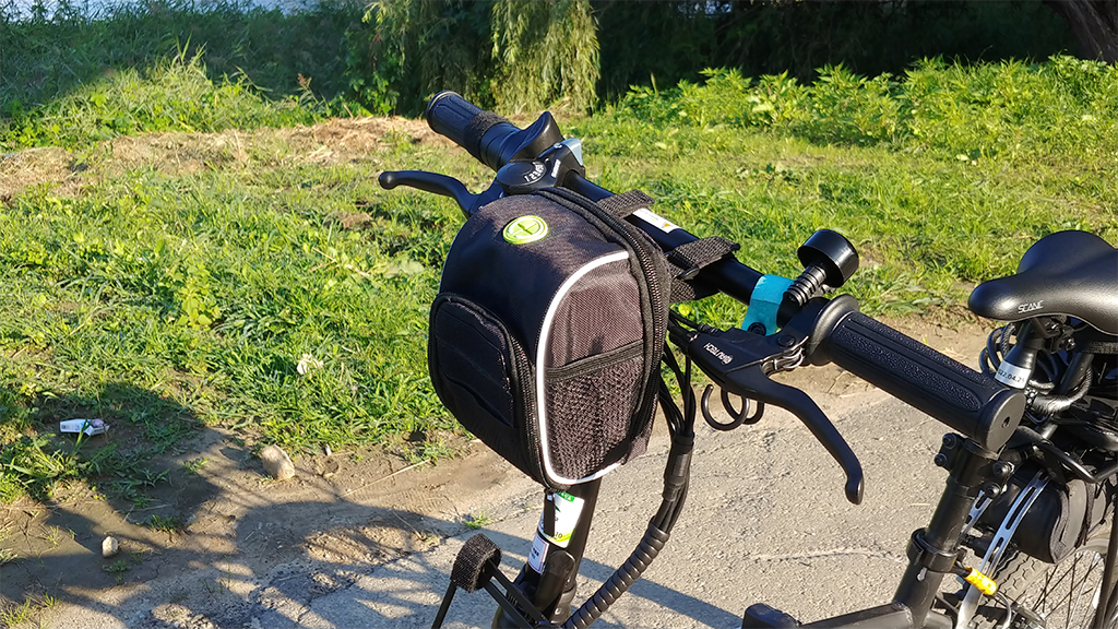 급한대로 다이소에서 2000원 짜리 작은 가방을 핸들에 묶어서 핸드폰도 넣고 보조배터리도 넣어 사용하였습니다.