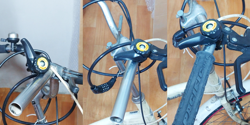 마지막으로, 변속기 레버를 자전거 핸들 프레임에 조립 고정하고, 핸들 그립을 장착합니다.