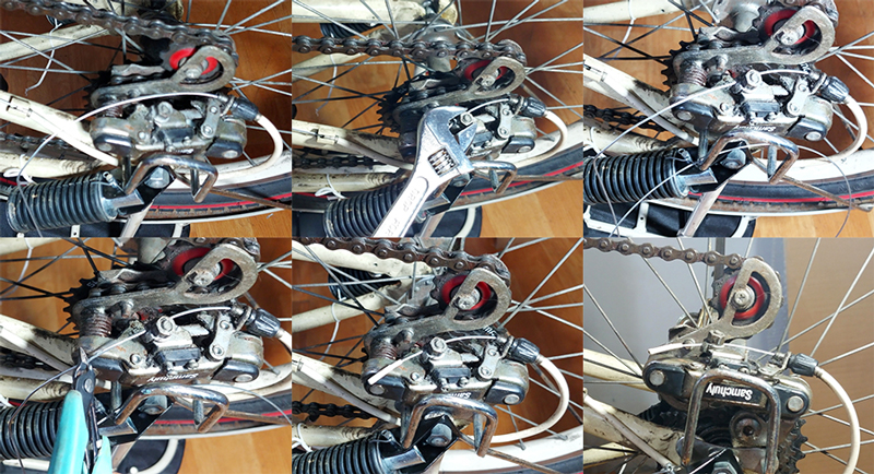 두 번째로, 뒷바퀴 기어에 장착된 체인 드레일러에 고정된 변속 속선을 분리합니다. 몽키 스패너를 이용하여 변속 속선을 고정하는 너트를 풀어줍니다.