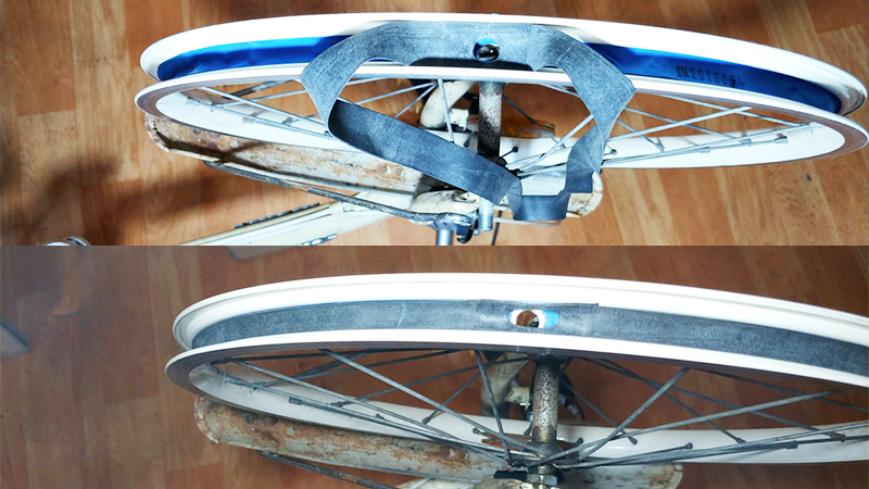 8. 림테이프의 구멍이 튜브 밸트 구멍과 같은 위치가 되도록 림테이프를 바퀴 프레임에 장착합니다.