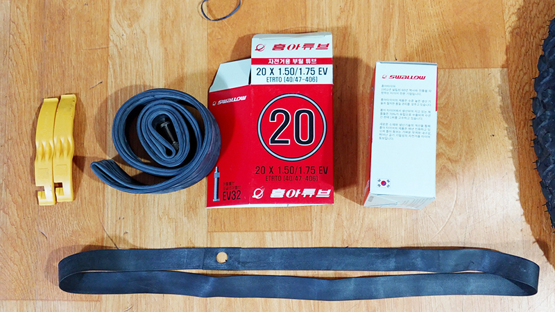 7. 새로운 튜브와 림테이프를 준비합니다. 참고로 림테이프가 장착되어 있는 경우에는 림테이프를 교체하지 않는 것을 추천합니다. 고무 림테이프를 미리 구매해두었으며, 타이어는 20인치이지만 꽉 장착되도록 18인치용 고무 림테이프를 구매하였는데, 20인치용 고무림테이프를 구매하는 것이 좋았을 거 같았습니다.