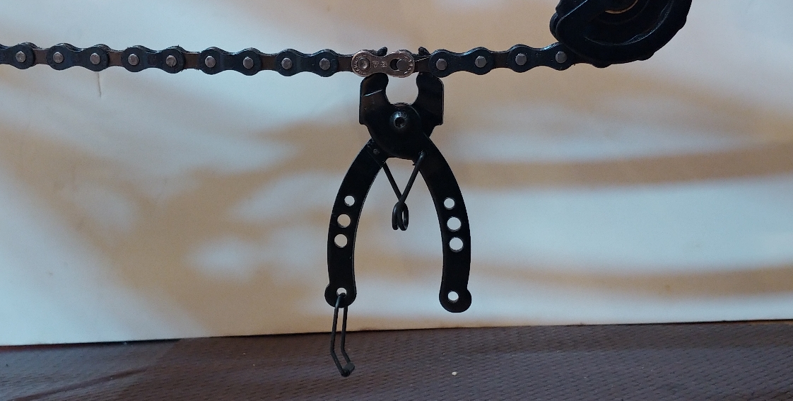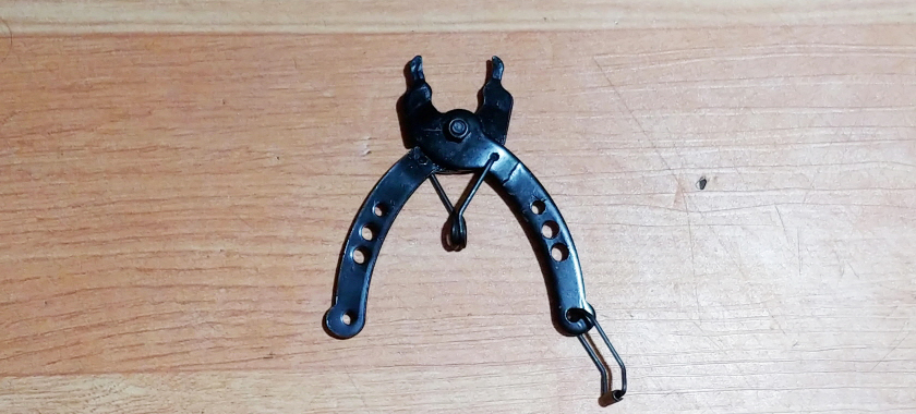 체인절단기 또는 체인리무버라고 합니다. 체인을 절단하는데 사용되며, 체인 마디를 연결하는 핀을 제거하여 체인 마디를 분리하는 도구입니다. 체인 교체하는 과정 중에서 대체가 불가능한 제일 중요한 도구인 듯 합니다.