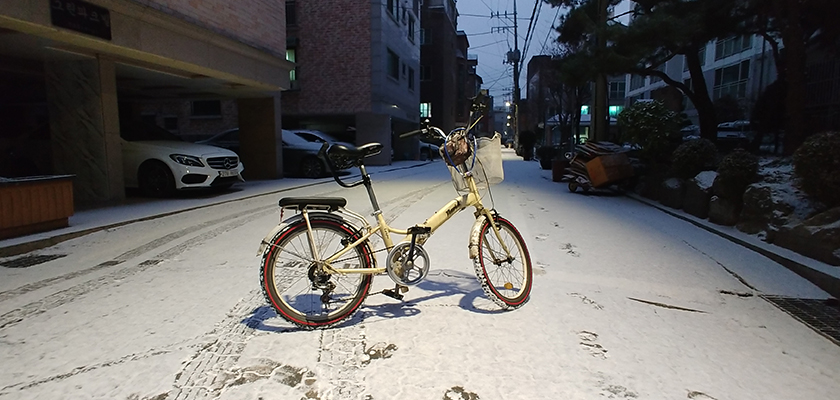 살짝 눈 쌓인 거리에서 자전거 라이딩을 하다가